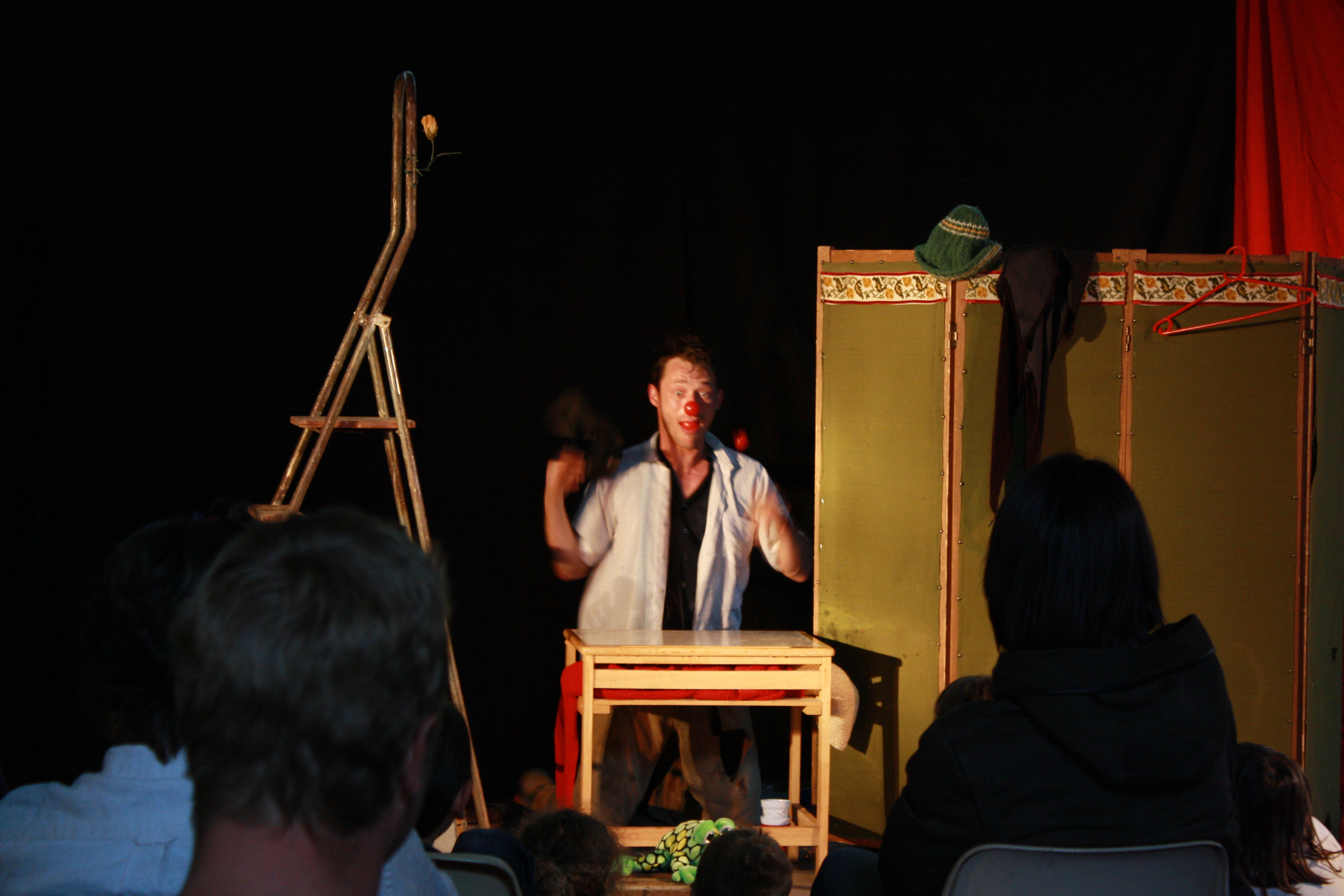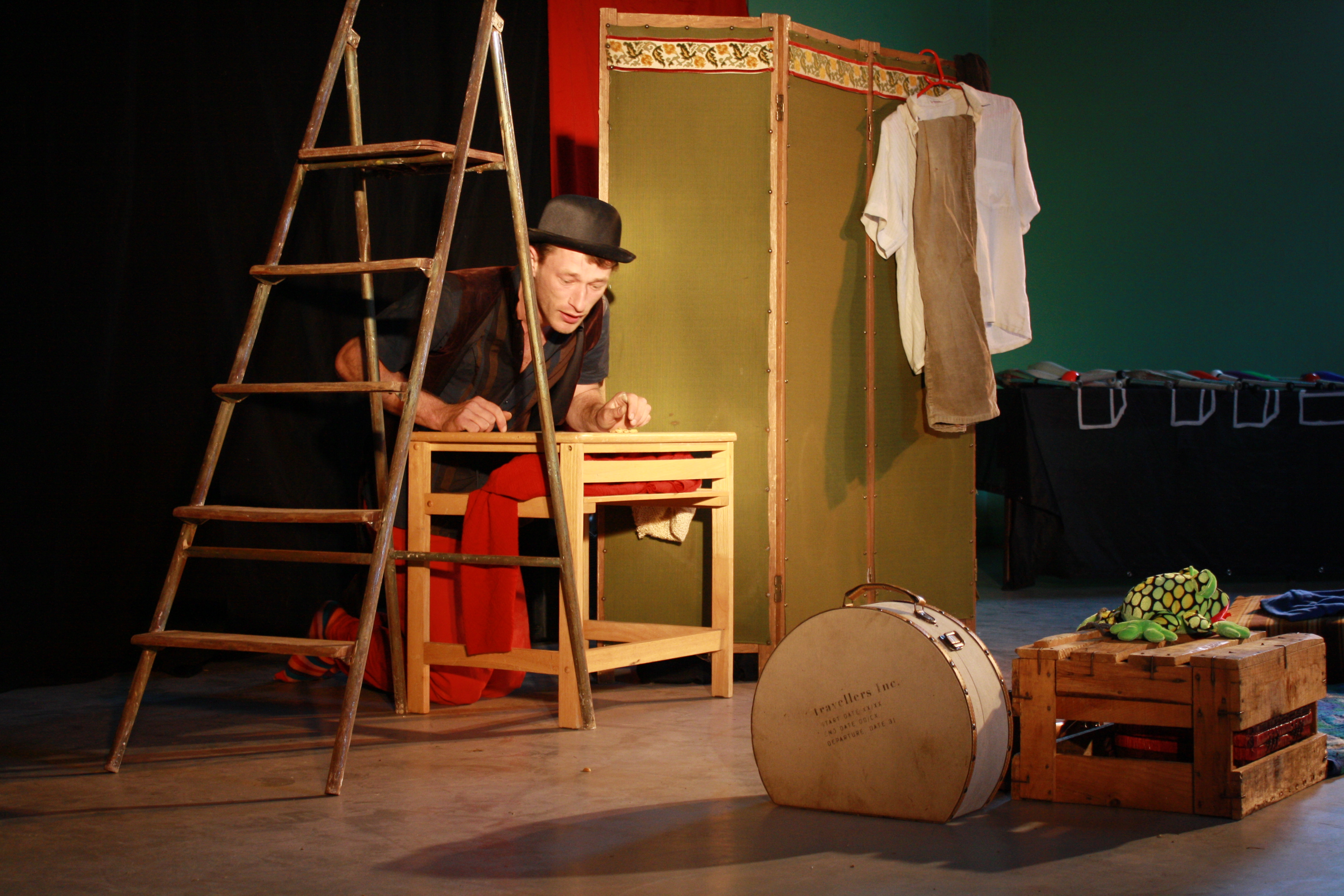Alors qu’il est dans son lit, le réveil sursaute, lui aussi… Une vache frappe à la porte, la brosse à dents l’ébouriffe et la grenouille n’en fait qu’à sa tête. Dans un décor mobile et vivant, un farfelu personnage s’est endormi chez lui comme à l’accoutumée sauf qu’aujourd’hui, tout va de guingois. Mâchant ses mots qui passent de travers, il découvre dans sa maison d’étonnants protagonistes qui n’ont de cesse d’animer l’espace de manière incongrue. Ce spectacle pour enfants et familles est avant tout un temps pour rire. Un dessin animé qui se joue sur scène, à l’instant précis où on le regarde.