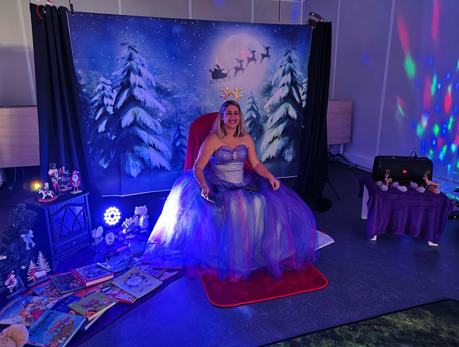 Notre conteuse, habillée en Princesse, tout droit sortie d’un conte de Fées, vous accueille dans un univers douillet, propice aux histoires… En fonction de l’affluence, tout au long de votre événement, elle alterne les récits, les chansons, les contes ; elle pose même avec les enfants pour des photos souvenir…