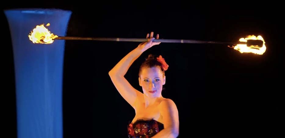 Ce numéro de feu mêle maîtrise technique et élégance, où éventails, bolas, hula staff et autres agrès flamboyants s'entrelacent pour dessiner des tableaux hypnotiques. Chaque geste embrase l’obscurité, chaque mouvement raconte une histoire enflammée.