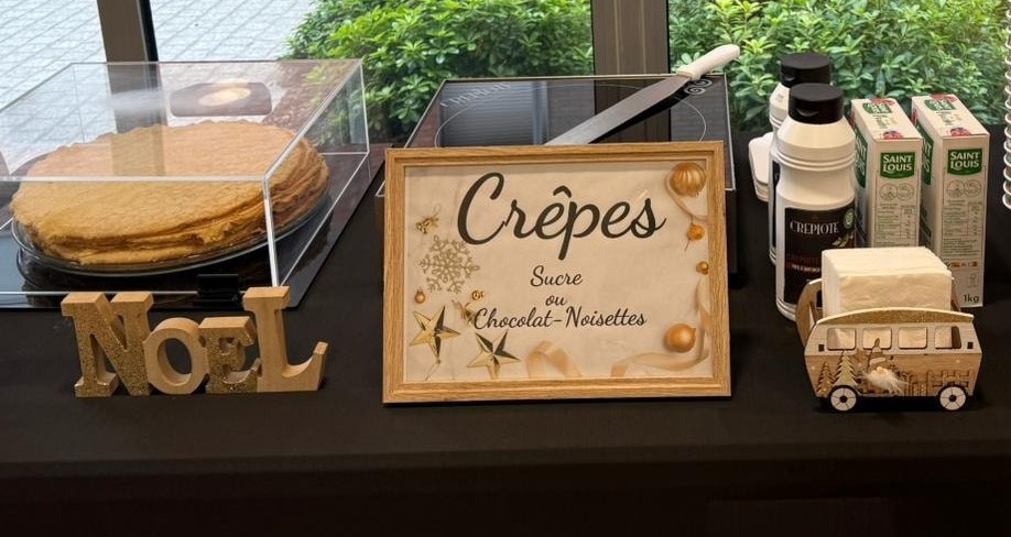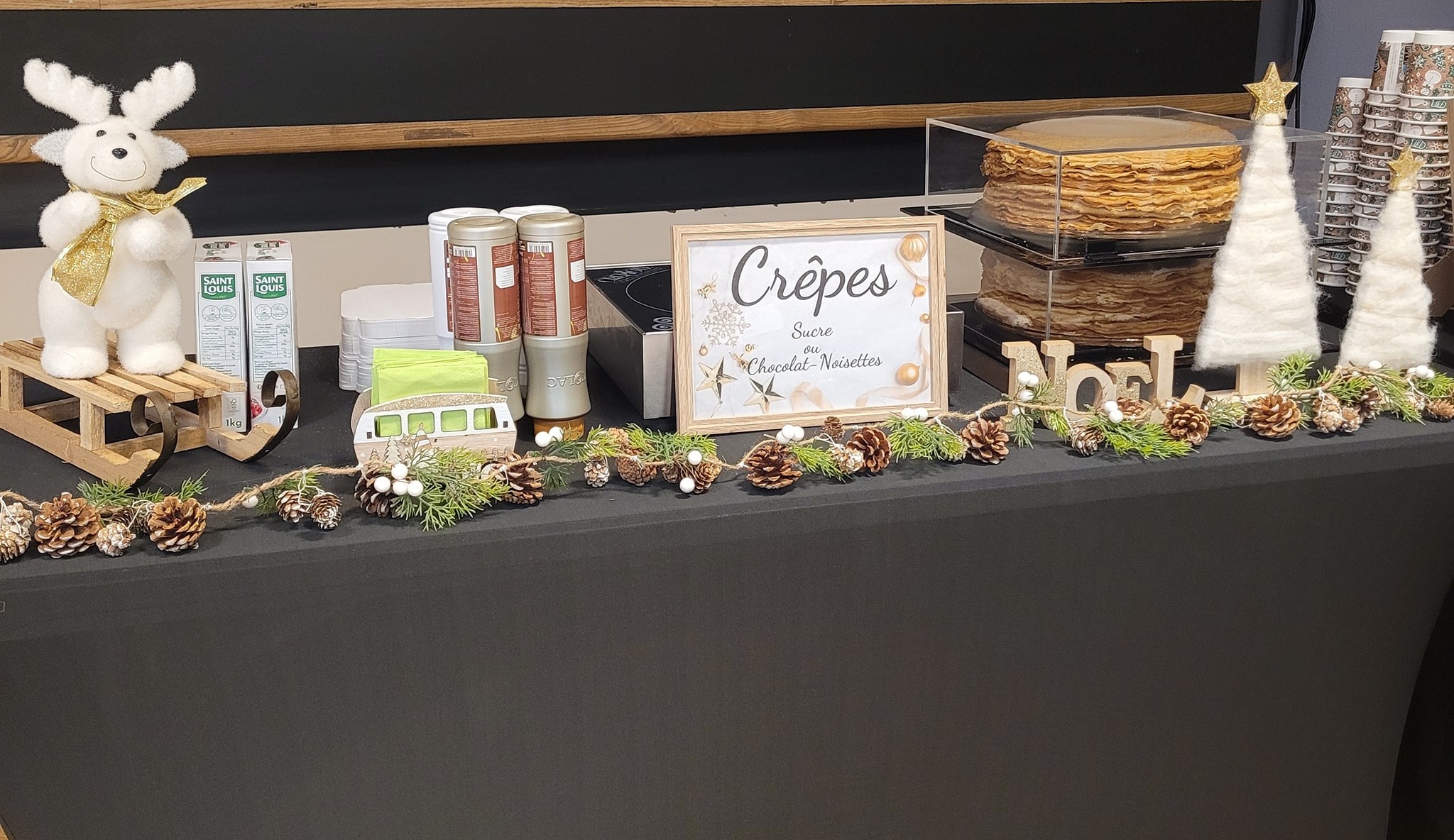 Un stand chaleureux et festif qui transforme votre Arbre de Noël en un véritable moment de partage et de douceur. Selon vos envies, vous pourrez garnir vos crêpes chaudes de sucre ou chocolat noisette.