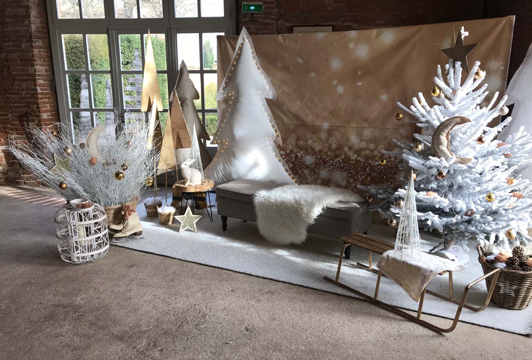 Avec le décor « Noël givré », nous partons sur des tons blancs et doré, alliant un sol en gazon synthétique blanc, des sapins en tissu et des éléments naturels (branchages, sapins, pommes de pins...), des lanternes et guirlandes, une banquette recouverte d'une douce fourrure…