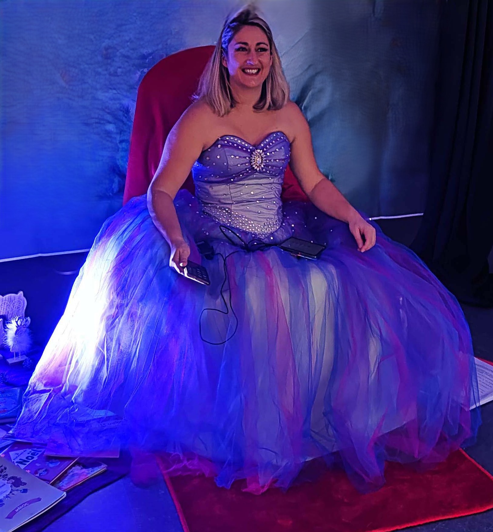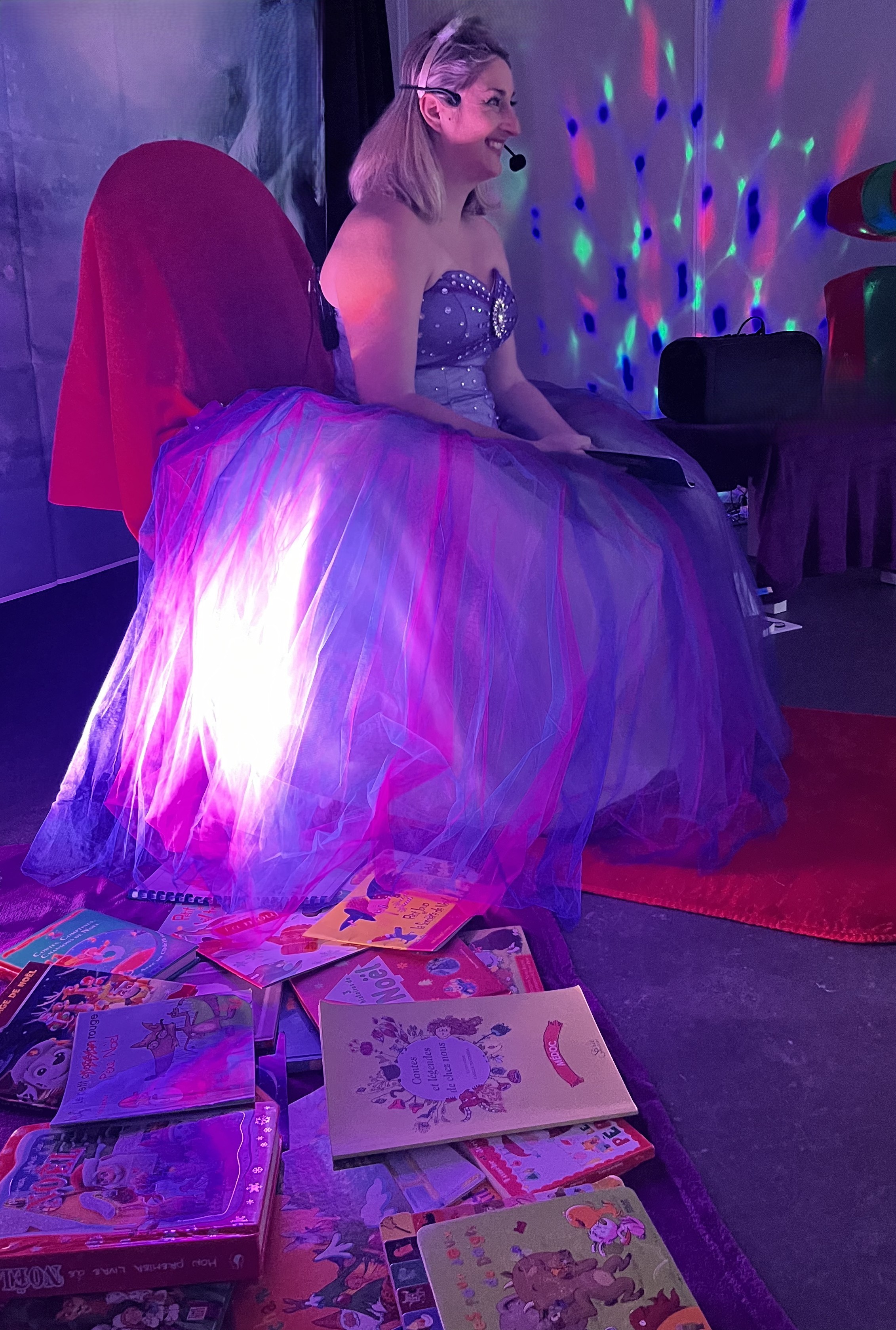 Notre conteuse, habillée en Princesse, tout droit sortie d’un conte de Fées, vous accueille dans un univers douillet, propice aux histoires… En fonction de l’affluence, tout au long de votre événement, elle alterne les récits, les chansons, les contes ; elle pose même avec les enfants pour des photos souvenir…