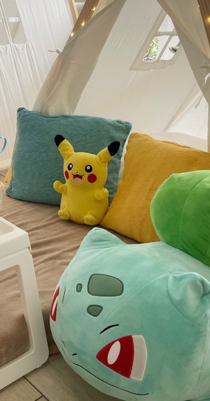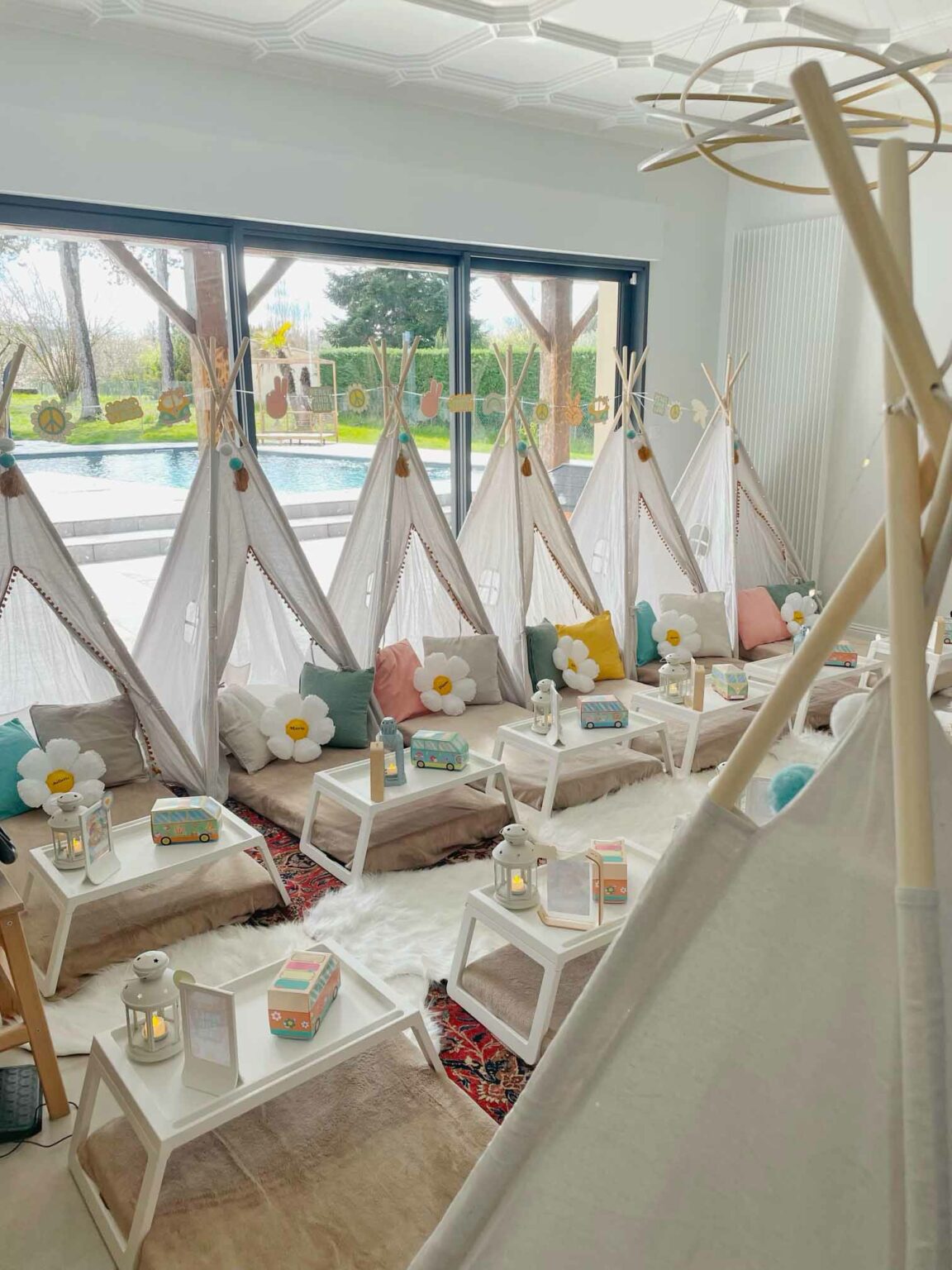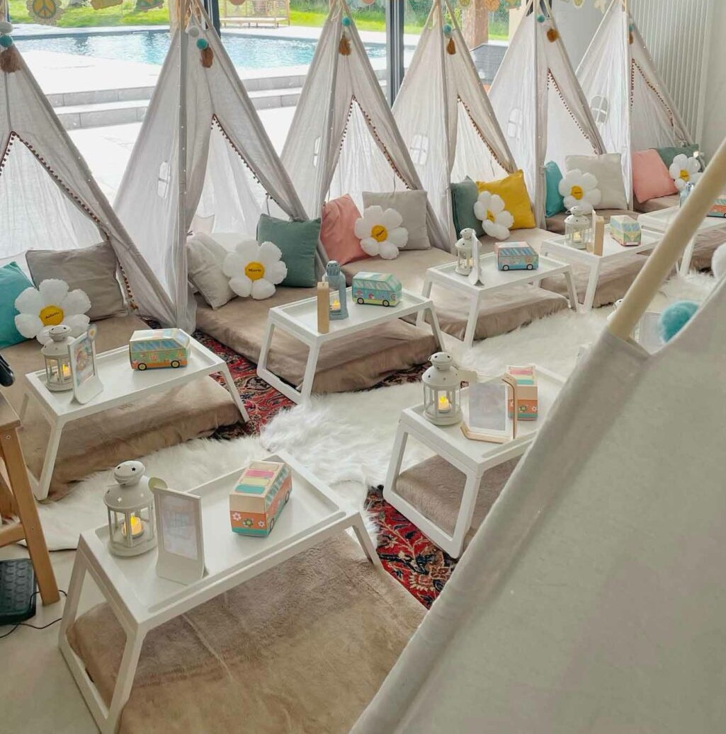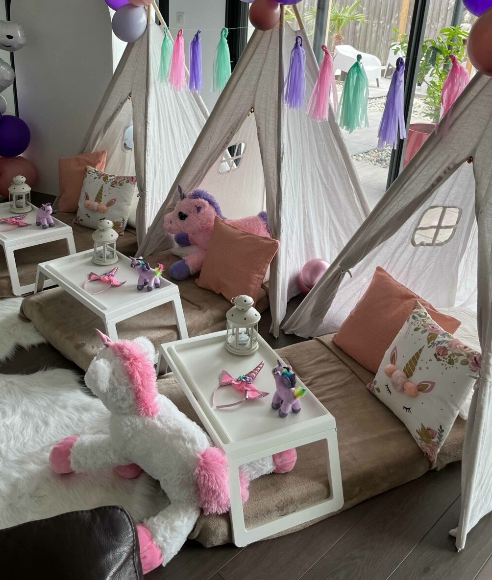 Chaque coin individuel comprend : tipi, matelas confortable, drap-housse, couverture polaire, coussins décoratifs & éléments de décoration thématique, guirlandes lumineuses douces.